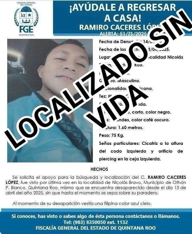 Othón P. Blanco.- La Fiscalía General del Estado informa que, tras localizar el cuerpo sin vida de Ramiro “N”, reportado como desaparecido el 13 de abril del presente año, inició…