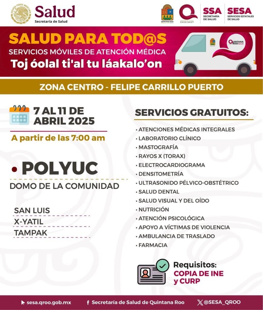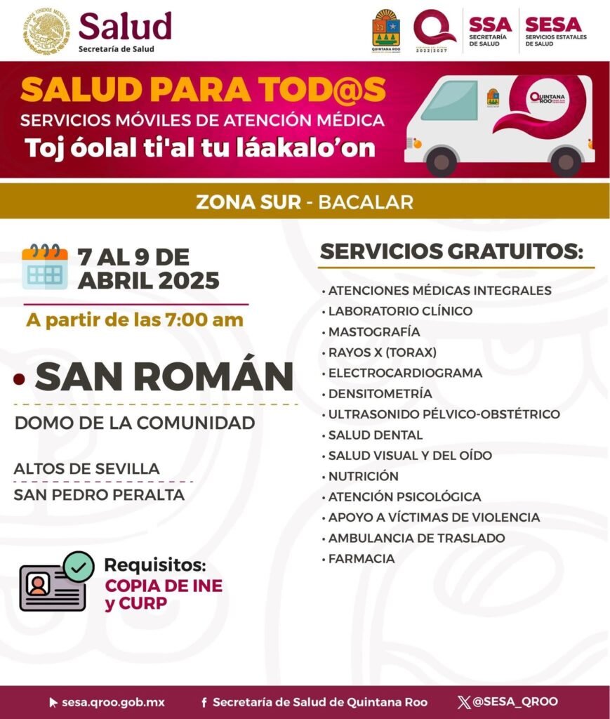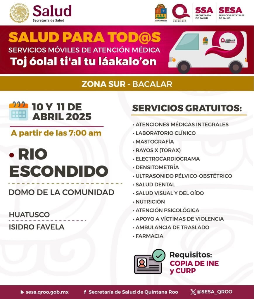 Chetumal. – Las caravanas de la salud llegaron a los municipios de Lázaro Cárdenas, Felipe Carrillo Puerto y Bacalar en donde atenderán de forma gratuita, oportuna, e integral a la población del 7 al 11 de abril, informó la gobernadora Mara Lezama Espinosa.