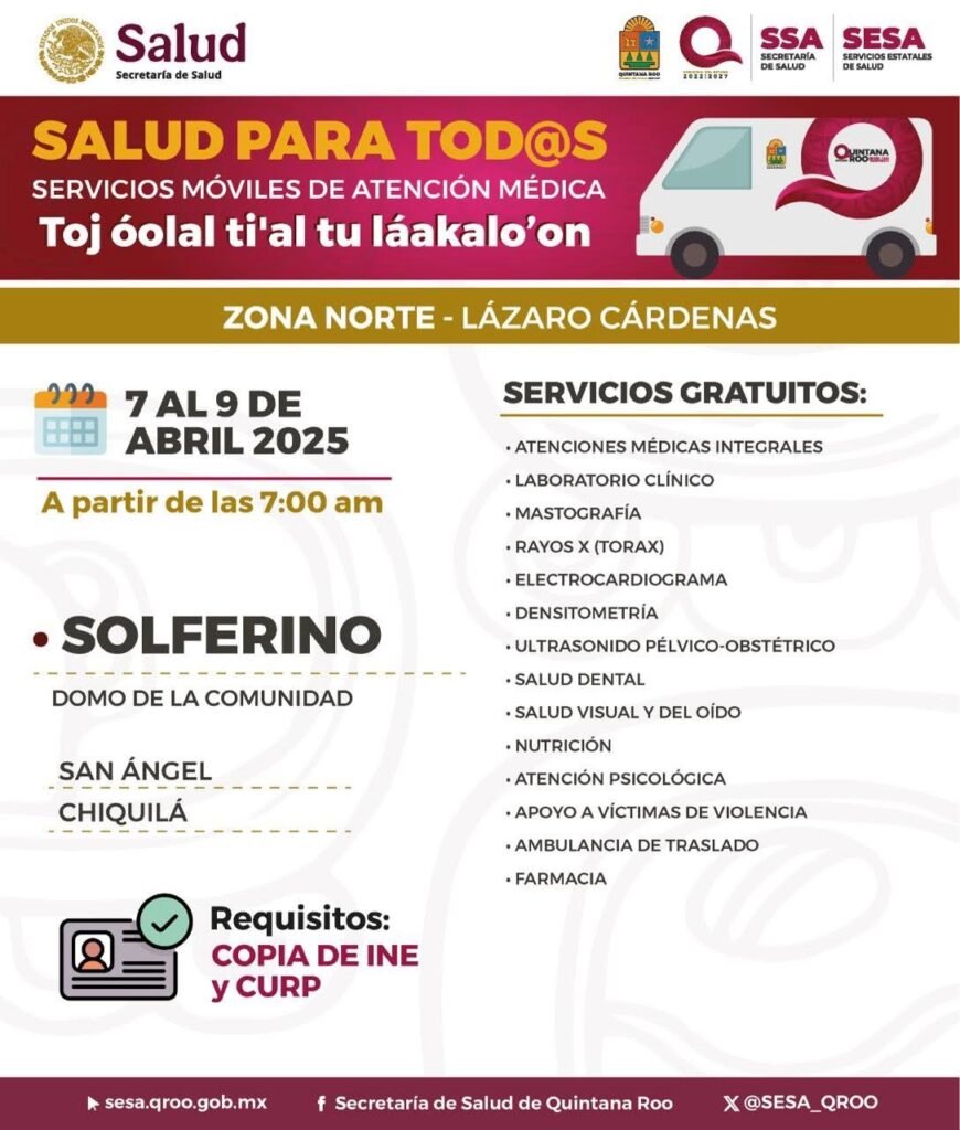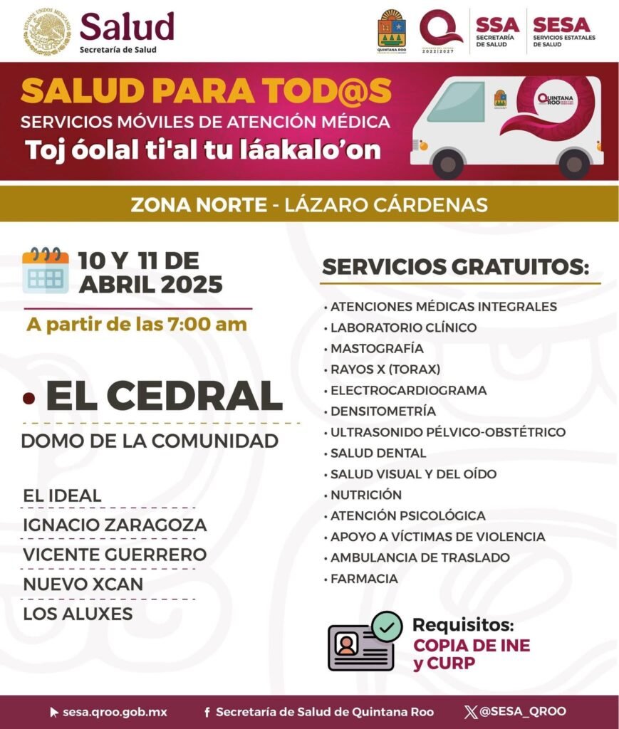 El secretario de Salud, Flavio Carlos Rosado, detalló que en el municipio de Lázaro Cárdenas se instalarán del 7 al 11 de abril en Solferino y los días 10 y 11 de abril en El Cedral.