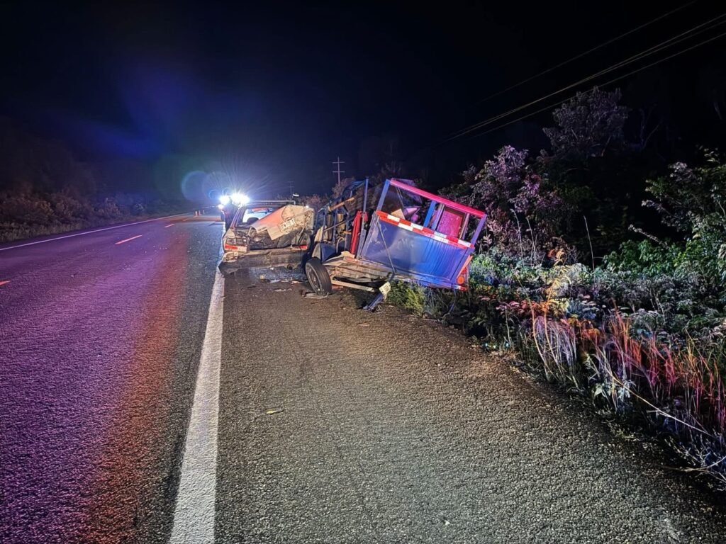 El aparatoso accidente ocurrió la noche de este lunes, a la altura del kilómetro 154, cuando una camioneta Toyota Tacoma, color blanco, que circulaba con dirección al sur, perdió el control por causas aún desconocidas y terminó impactándose de frente contra un Nissan Tsuru estacionado en el acotamiento.